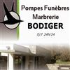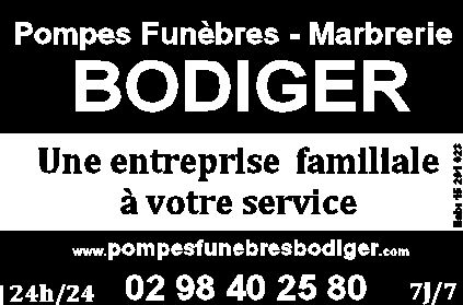 Les Pompes Funèbres - Marbrerie BODIGER, une entreprise familiale, quivous accompagnent 24h/24 et 7j/7, avec une organisation complète des funérailles sur l’ensemble du Finistère.Nous vous donnons accès à TOUS les Centres Funéraires et Crématoriums Nous effectuons tous types de travaux de marbrerie de cimetière, de la vente de monuments, à la réalisation de gravures.BODIGER FLEURS, à travers son magasin, vous proposent un grand choix de fleurs, pour vos compositions florales, pour tous les événements.