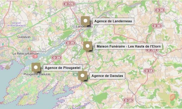 La Maison Funéraire "les Hauts de l'Elorn" se trouve sur le commune de Dirinon, au Stum. Elle est au carrefour des communes de Landerneau, Dirinon, Daoulas et Saint Urbain. En prenant la direction de la maison funéraire, vous allez arriver sur le carrefour giratoire du Stum à Dirinon, il faut alors prendre la direction de Saint Urbain, poursuivre sur environ 100m et vous y serez.