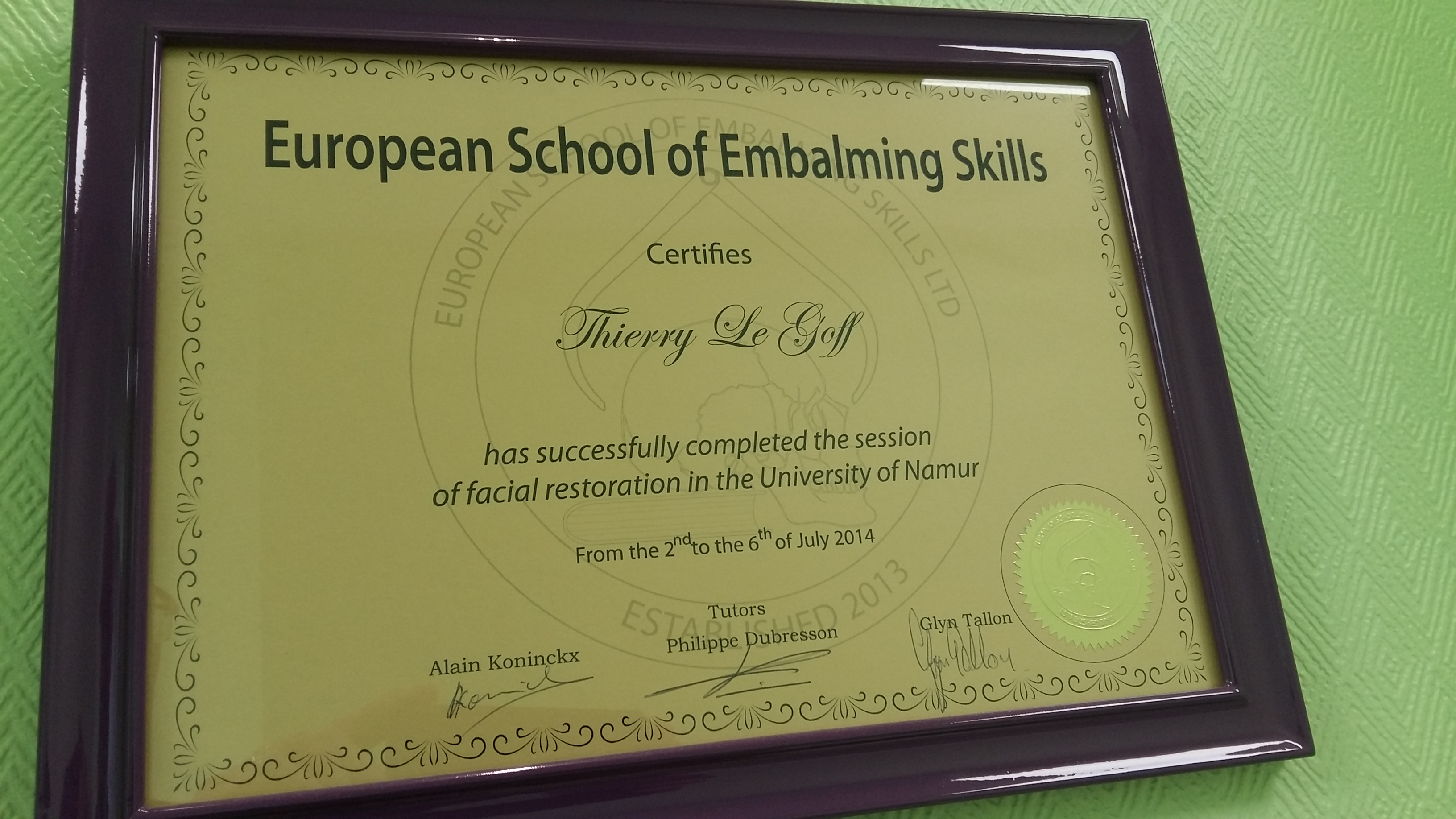 Titulaire depuis juillet 2005 du diplôme national de thanatopracteur et formé en restauration faciale en 2014 auprès de la faculté de médecine de Namur, en Belgique, par la European School of Embalming Skills, il saura répondre à vos attentes de présentation de votre défunt avec professionnalisme.
