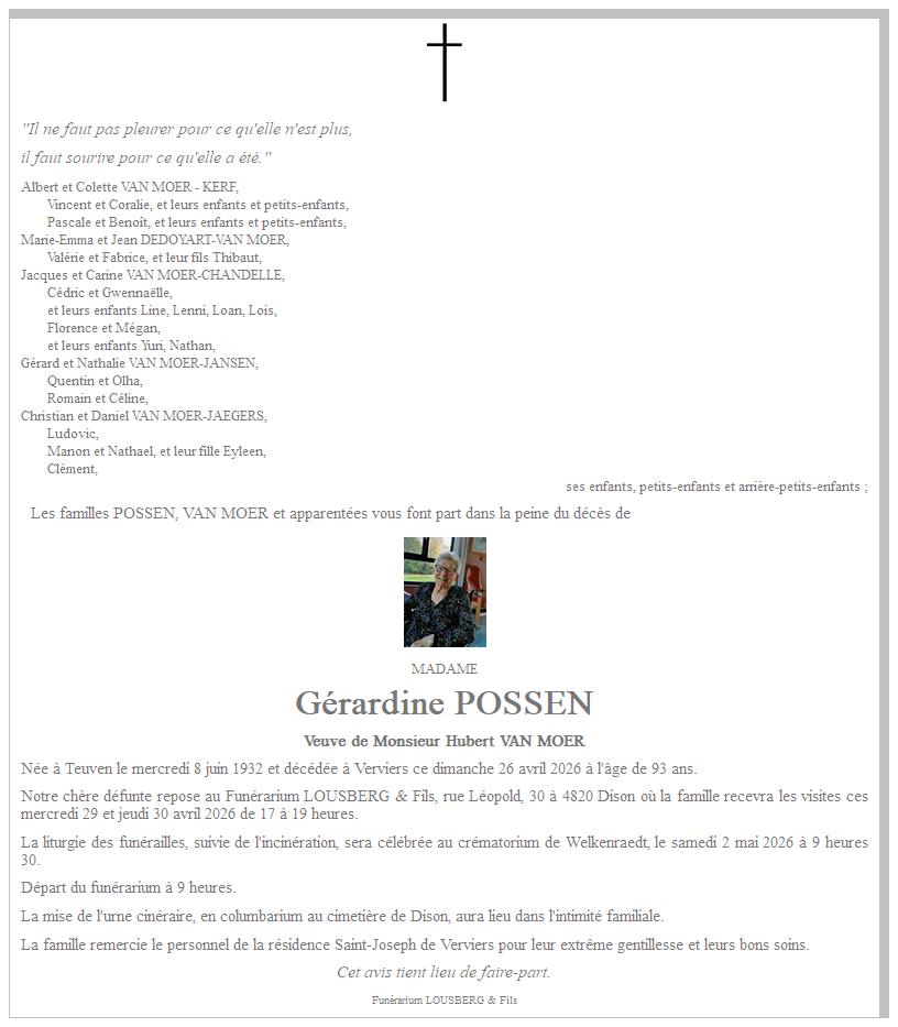 Décédée à Verviers (4800) le dimanche 26 avril 2026 à l'âge de 93 ans