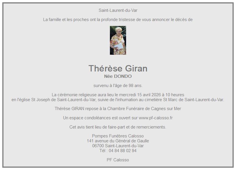 Avis de décès de Madame Thérèse Giran née DONDO