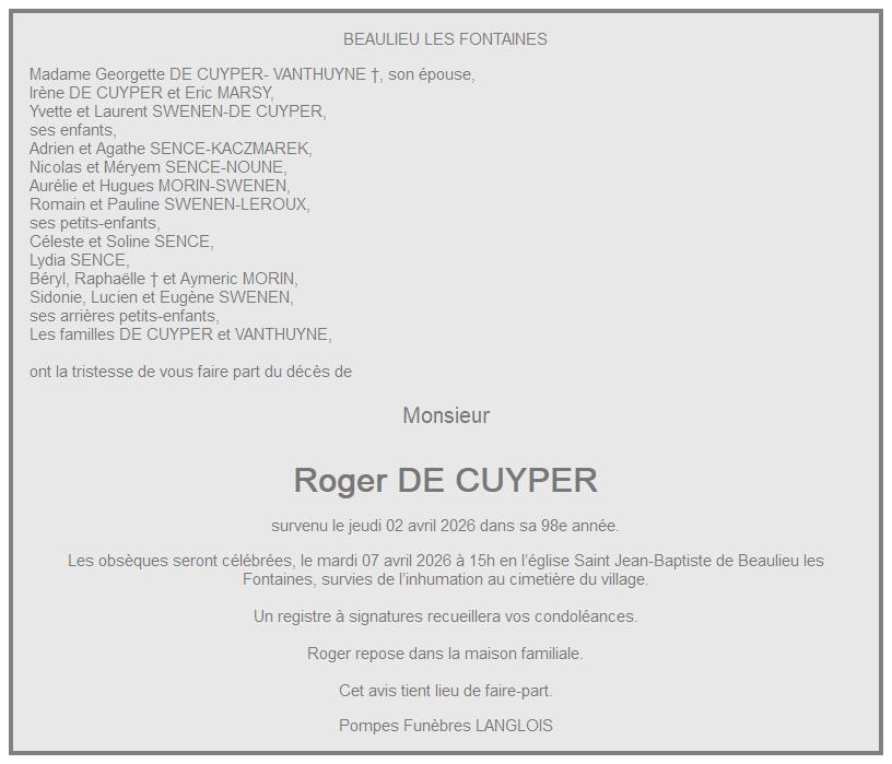 Avis de décès de Monsieur Roger DE CUYPER