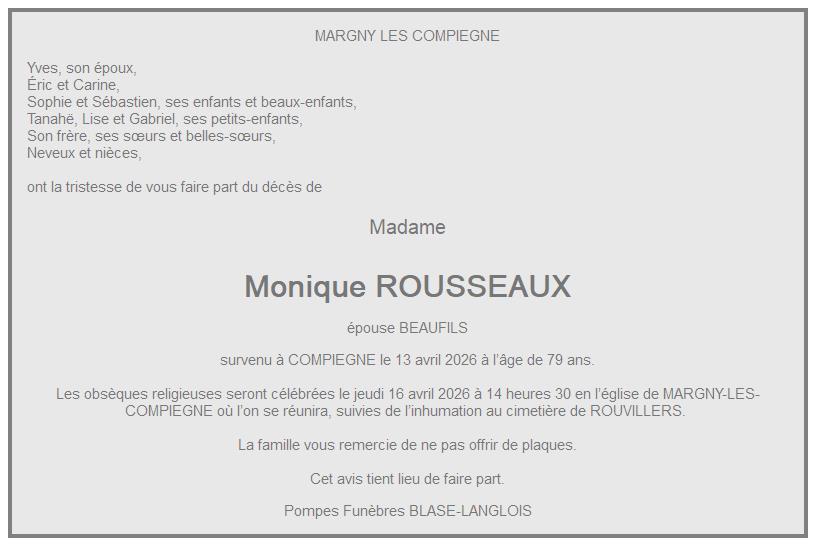 Avis de décès de Madame Monique BEAUFILS née ROUSSEAUX