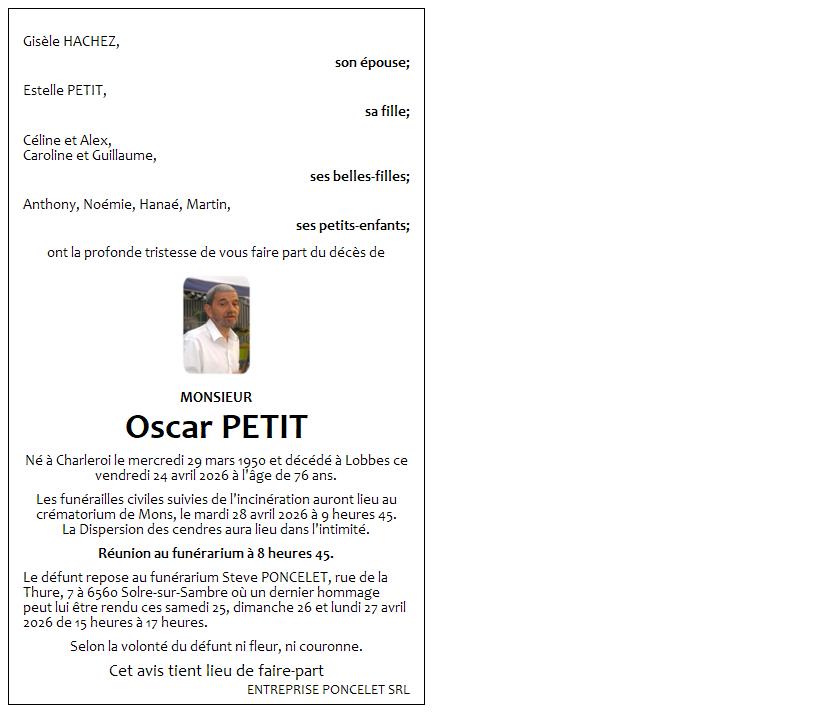 Décédé à Lobbes (6540) le vendredi 24 avril 2026 à l'âge de 76 ans