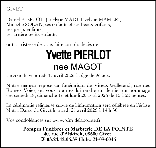 Avis de décès de Madame Yvette Pierlot née MAGOT