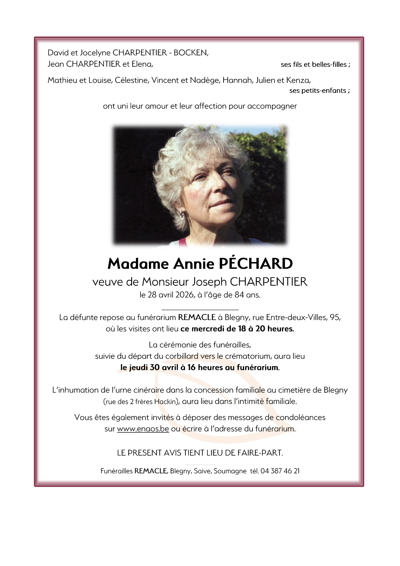 Funérailles REMACLE de Blegny le jeudi 30 avril à 16 heures