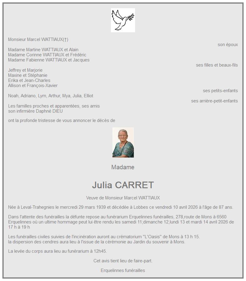 crématorium de l'Oasis (Mons) le jeudi 16 avril à 13 heures 15