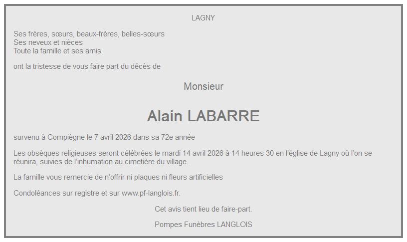 Avis de décès de Monsieur Alain LABARRE