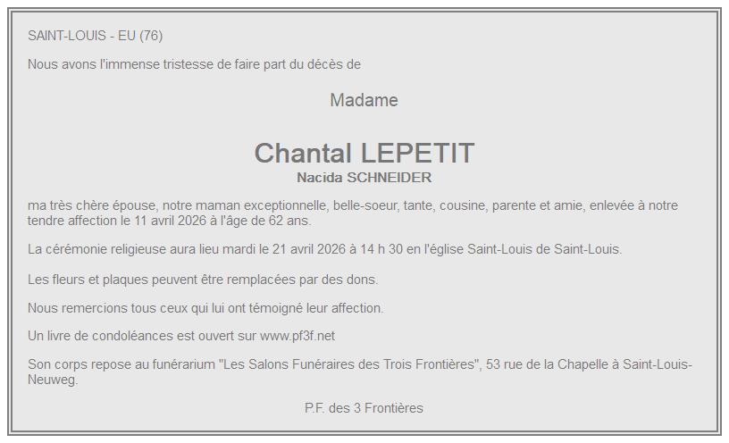 Overlijdensbericht van Madame Chantal LEPETIT geboren SCHNEIDER