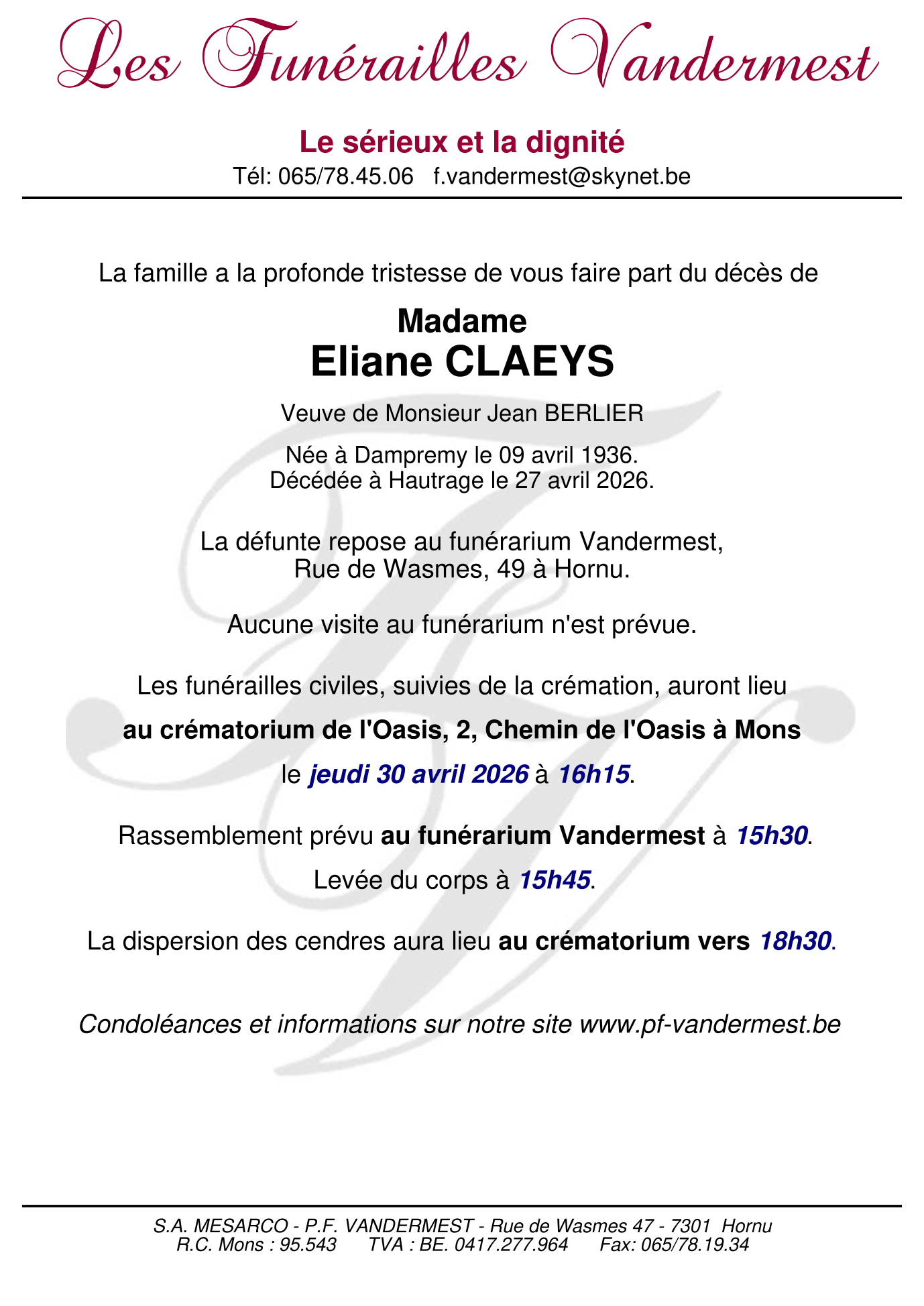 Crématorium de Mons le jeudi 30 avril à 16 heures 45