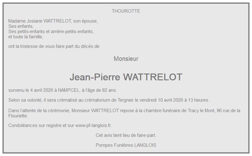 Avis de décès de Monsieur Jean-Pierre WATTRELOT
