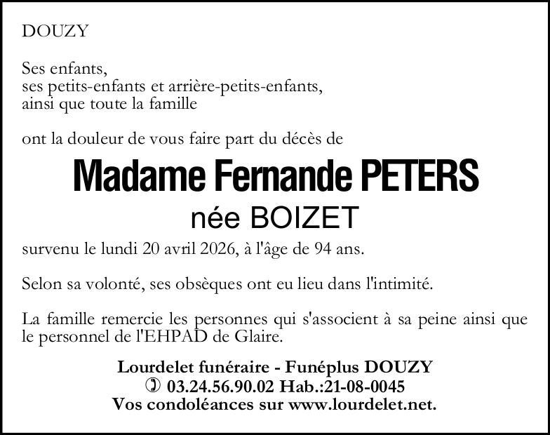 Avis de décès de Madame Fernande PETERS née BOIZET