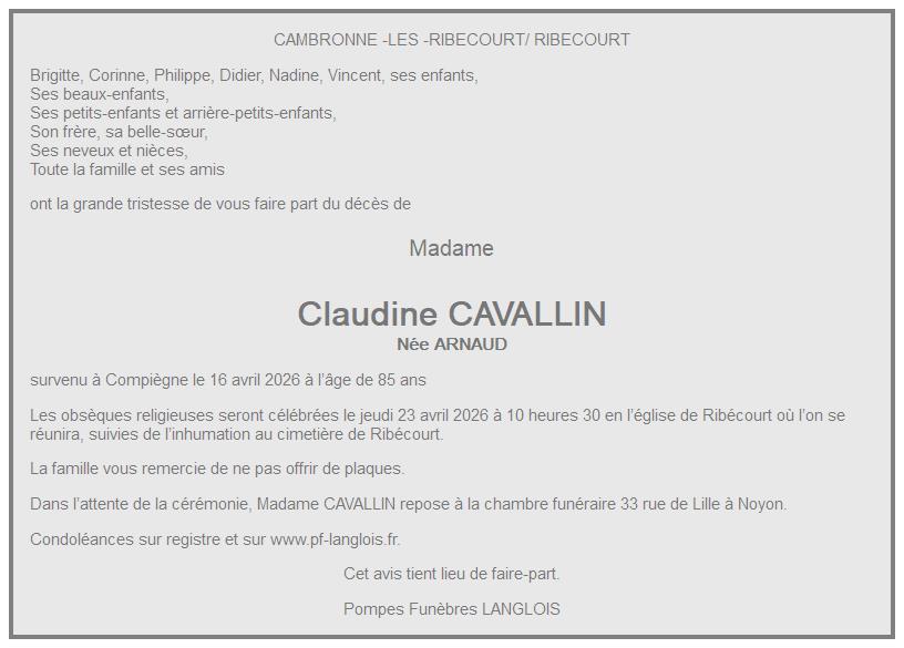 Avis de décès de Madame Claudine CAVALLIN née ARNAUD