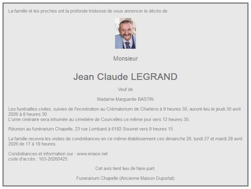 Avis de décès de Monsieur Jean Claude LEGRAND