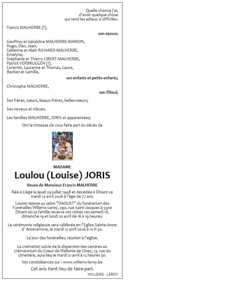 Les cendres seront dispersées au Crématorium du Coeur de Wallonie, le mardi 21 avril à 15 heures.
