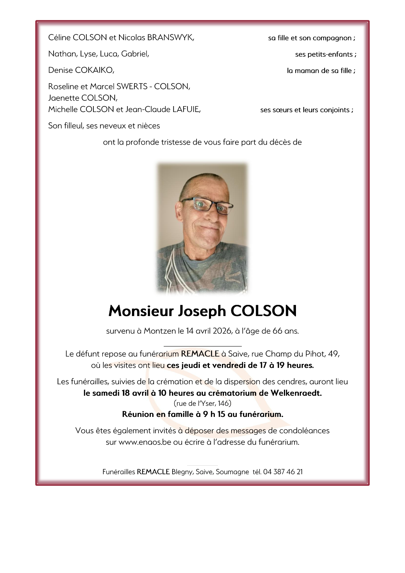 Décédé à Plombières (4850) le mardi 14 avril 2026 à l'âge de 66 ans