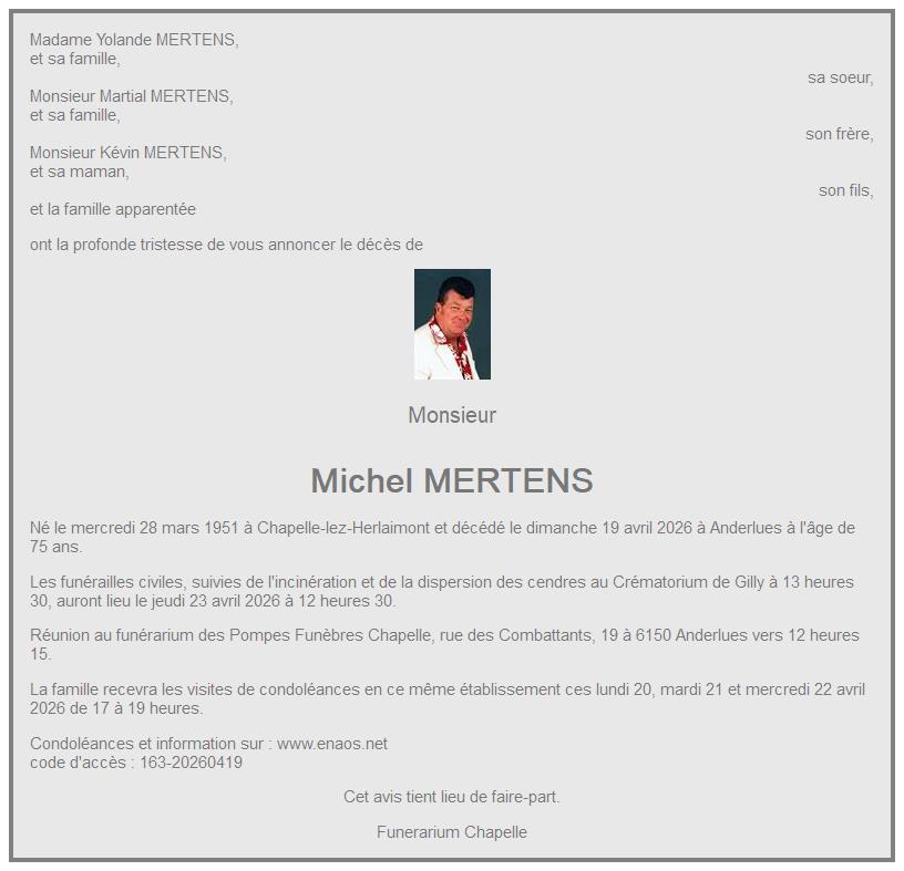 Avis de décès de Monsieur Michel MERTENS