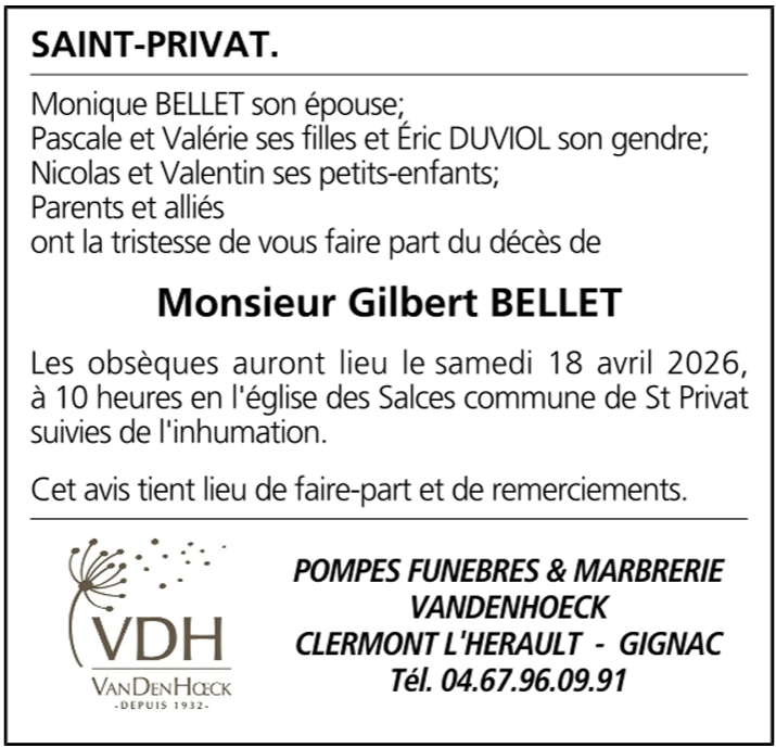 Décédé à Saint-Privat (34700, France) le mercredi 15 avril 2026 à l'âge de 90 ans