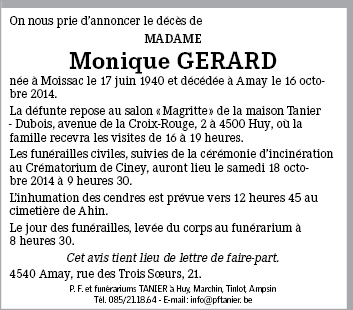 Décédée à Amay (4540) le jeudi 16 octobre 2014 à l'âge de 74 ans