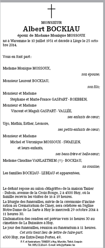 Décédé à Liège (4000) le samedi 25 octobre 2014 à l'âge de 63 ans