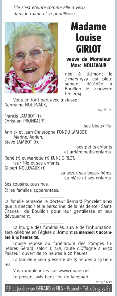 Décédée à Bouillon (6830) le dimanche 2 novembre 2014 à l'âge de 85 ans