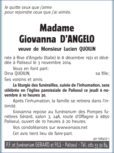 Fallecida en Paliseul (6850) el lunes, 3 de noviembre de 2014 a la edad de 82 años