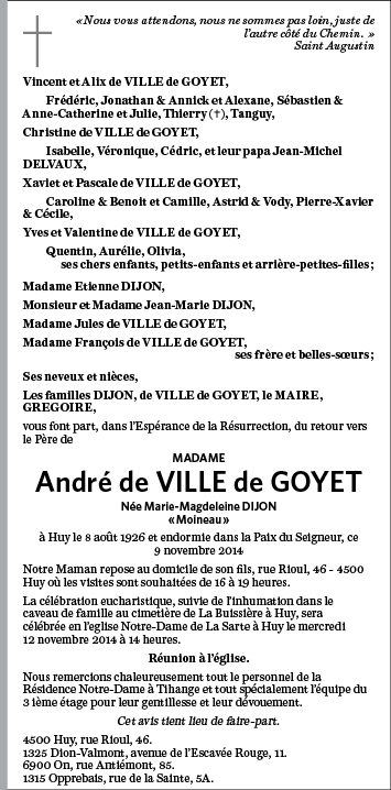 Died in Huy (4500) on 09 November 2014 at the age of 88 years