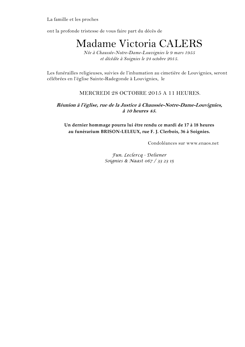 Décédée à Soignies (7060) le samedi 24 octobre 2015 à l'âge de 60 ans