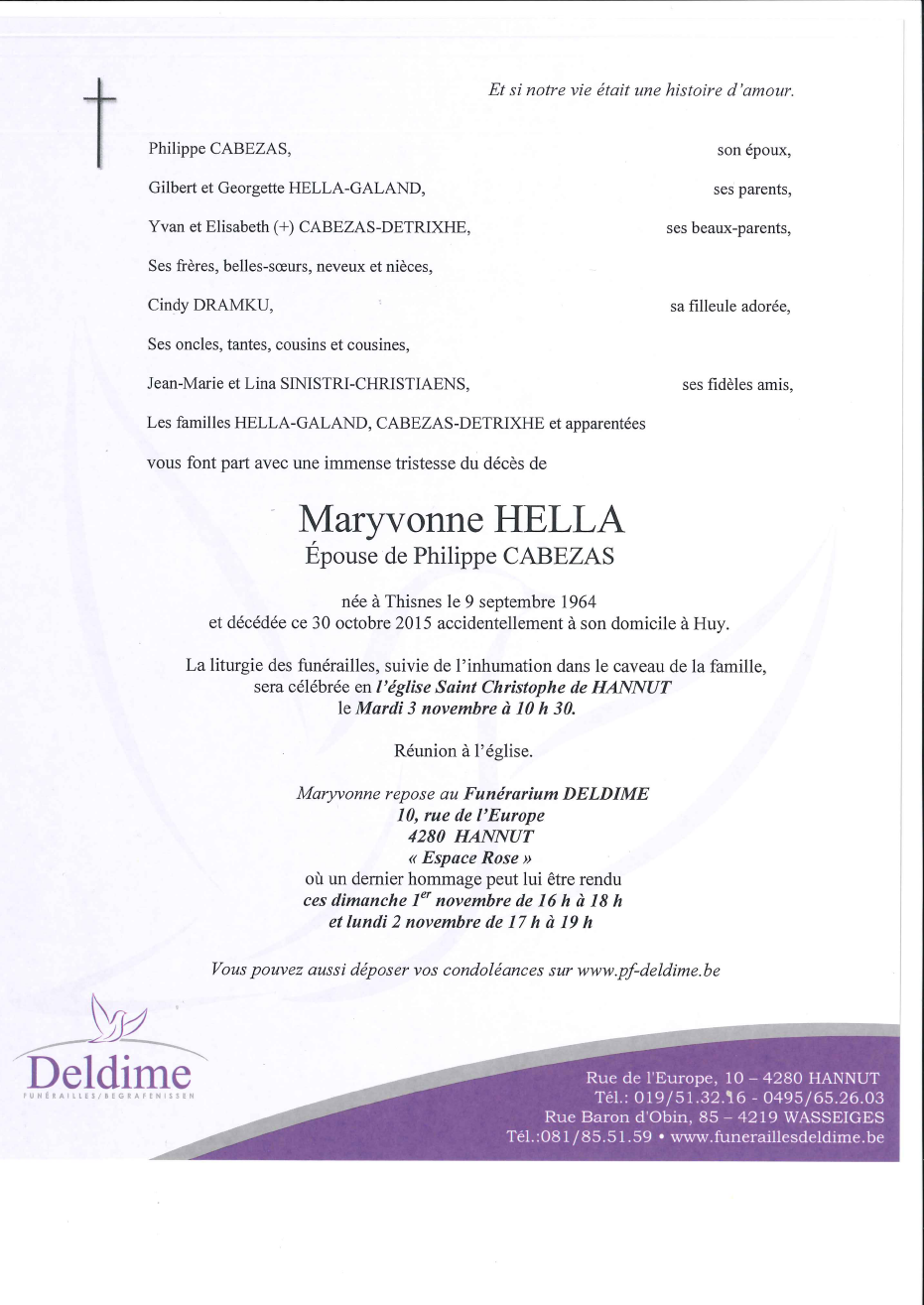 Décédée à Huy (4500) le vendredi 30 octobre 2015 à l'âge de 51 ans