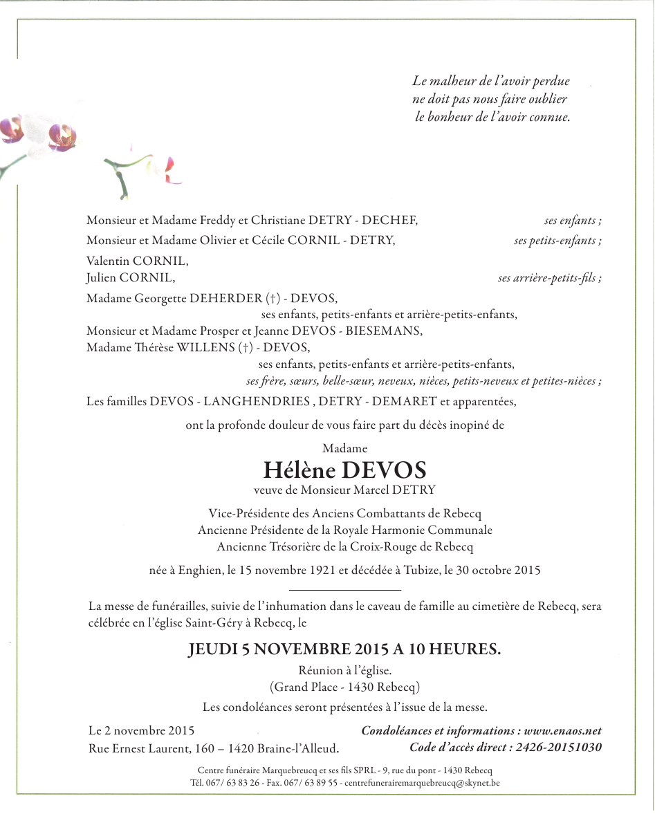 Died in Tubize (1480) on 30 October 2015 at the age of 93 years