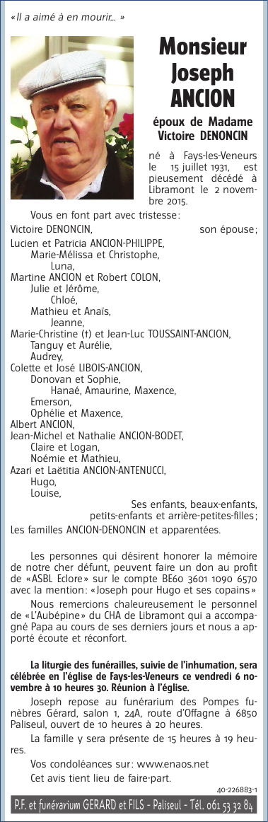 Fallecido en Libramont (6800) el lunes, 2 de noviembre de 2015 a la edad de 84 años