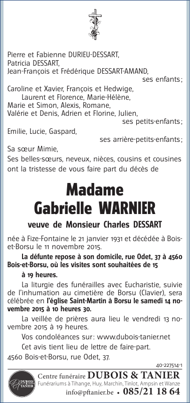 Fallecida en Bois-et-Borsu (4560) el miércoles, 11 de noviembre de 2015 a la edad de 84 años