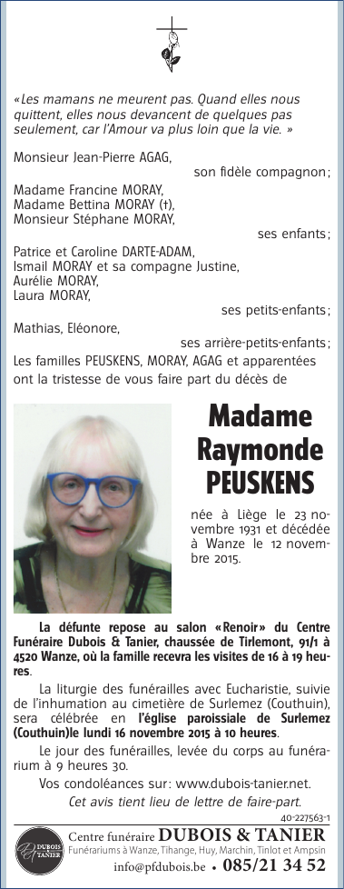 Décédée à Wanze (4520) le jeudi 12 novembre 2015 à l'âge de 83 ans