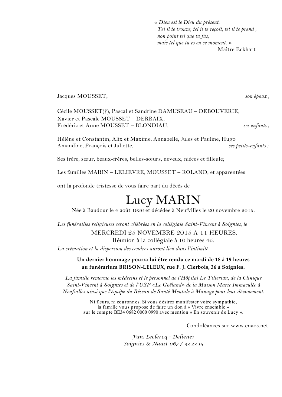 Décédée à Neufvilles (7063) le vendredi 20 novembre 2015 à l'âge de 79 ans