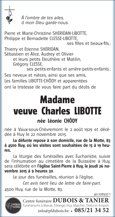 Décédée à Huy (4500) le dimanche 22 novembre 2015 à l'âge de 86 ans