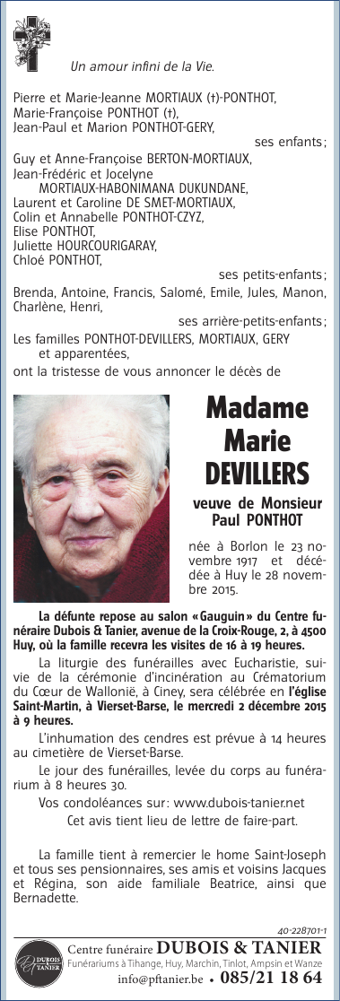 Décédée à Huy (4500) le samedi 28 novembre 2015 à l'âge de 98 ans