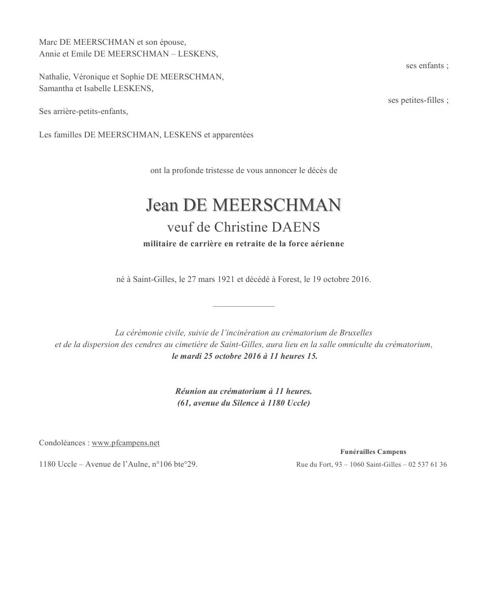 Décédé à Forest (1190) le mercredi 19 octobre 2016 à l'âge de 96 ans