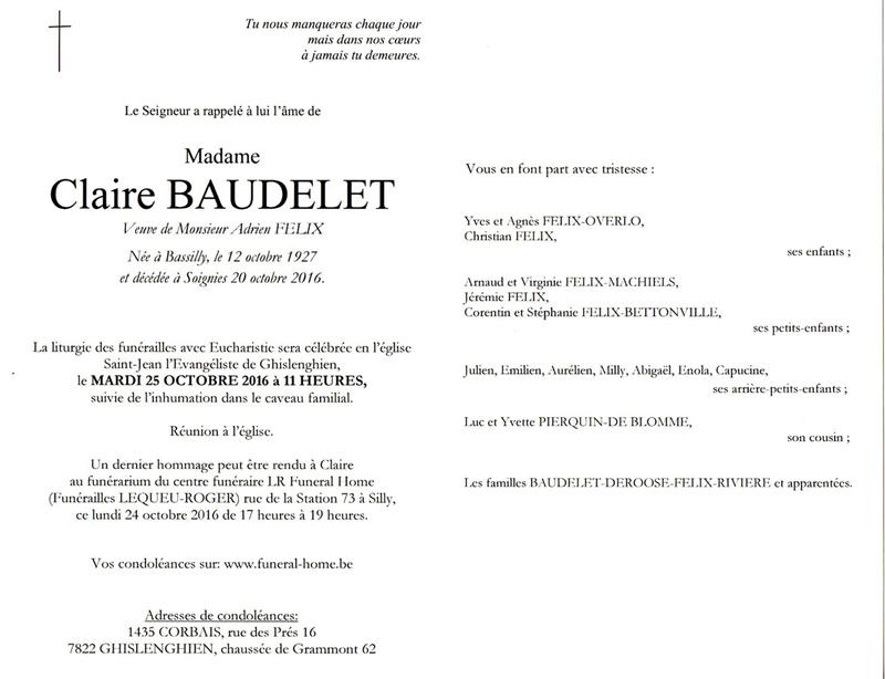 Décédée à Soignies (7060) le jeudi 20 octobre 2016 à l'âge de 89 ans