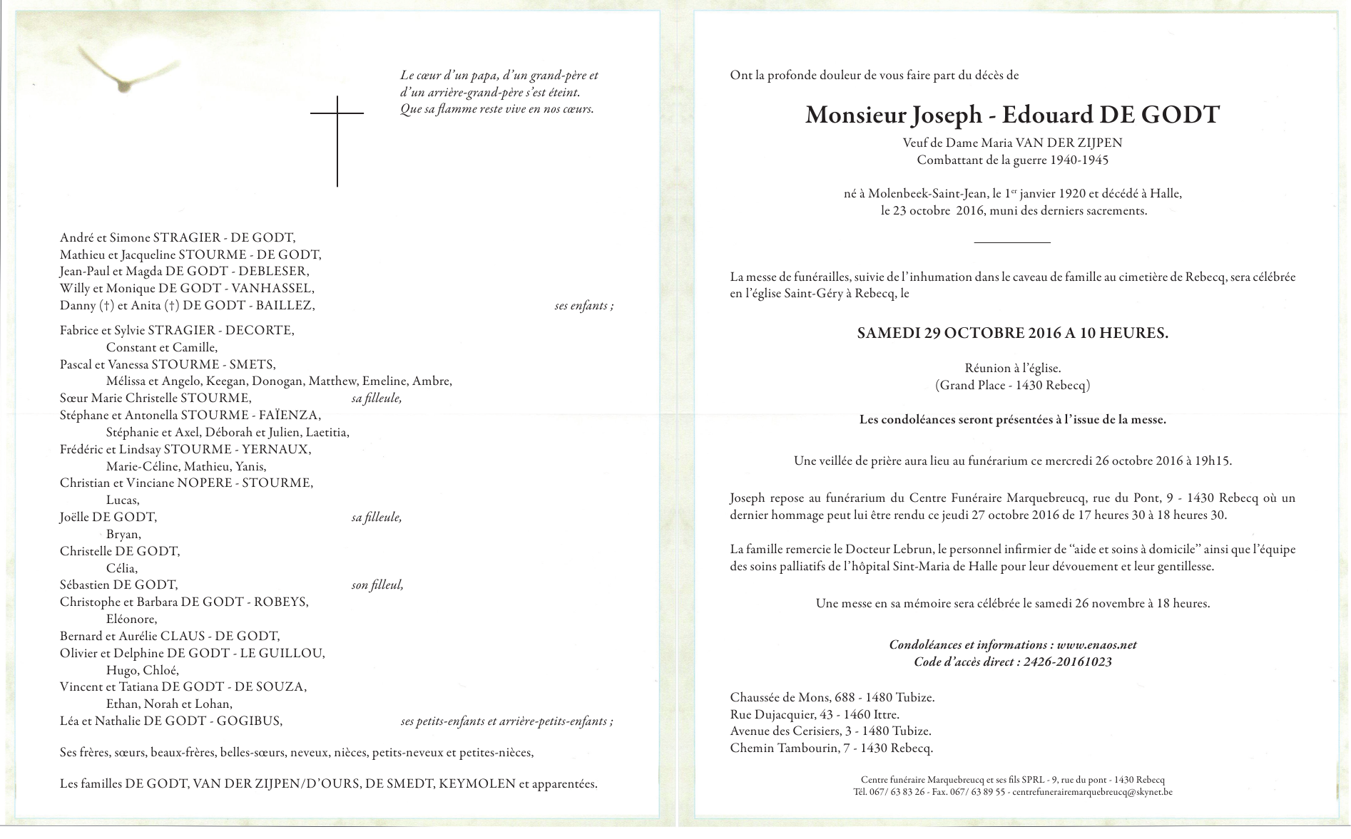Décédé à Halle (1500) le dimanche 23 octobre 2016 à l'âge de 96 ans
