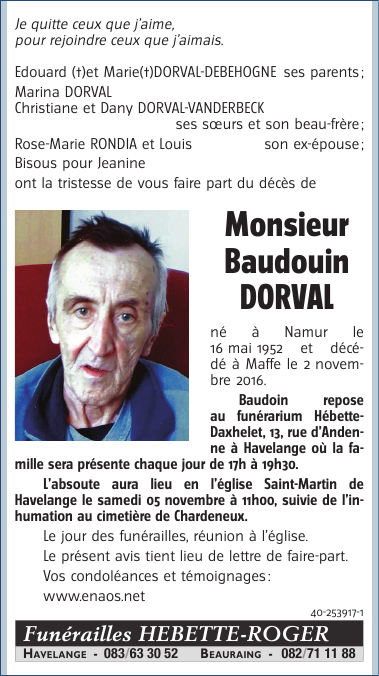 Décédé à Maffe (5374) le mercredi 2 novembre 2016 à l'âge de 64 ans