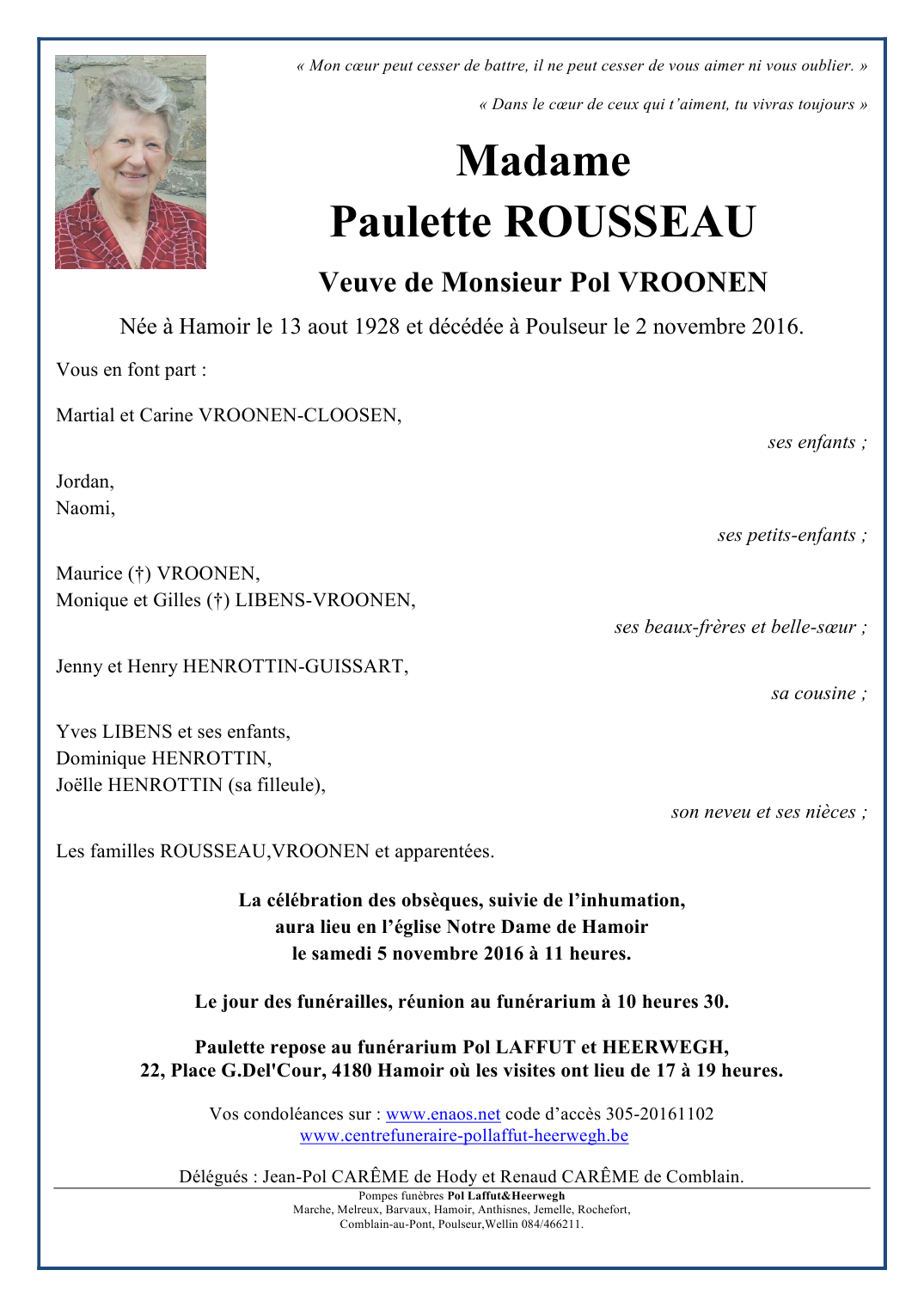 Décédée à Poulseur (4171) le mercredi 2 novembre 2016 à l'âge de 88 ans
