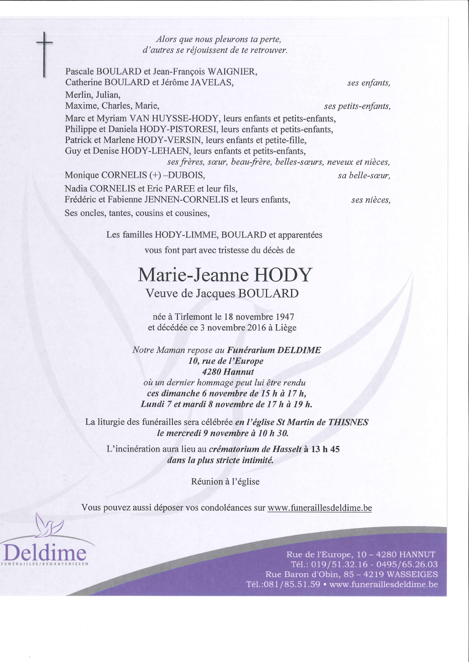 Décédée à Liège (4000) le jeudi 3 novembre 2016 à l'âge de 68 ans