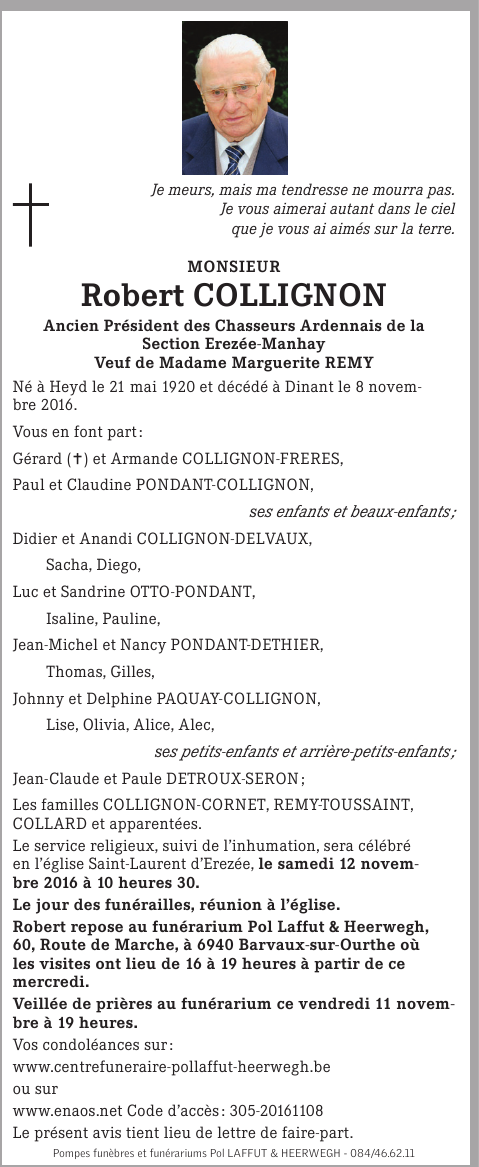 Died in Dinant (5500) on 08 November 2016 at the age of 96 years