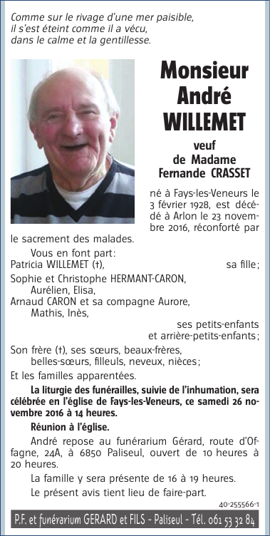 Décédé à Arlon (6700) le mercredi 23 novembre 2016 à l'âge de 88 ans