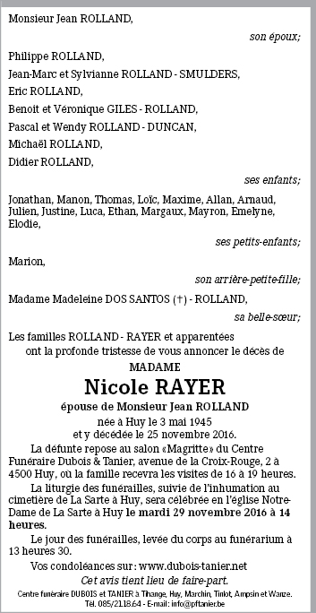 Décédée à Huy (4500) le vendredi 25 novembre 2016 à l'âge de 71 ans