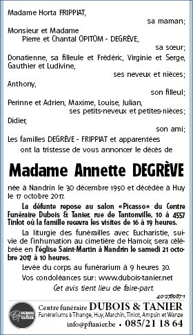 Décédée à Huy (4500) le mardi 17 octobre 2017 à l'âge de 66 ans