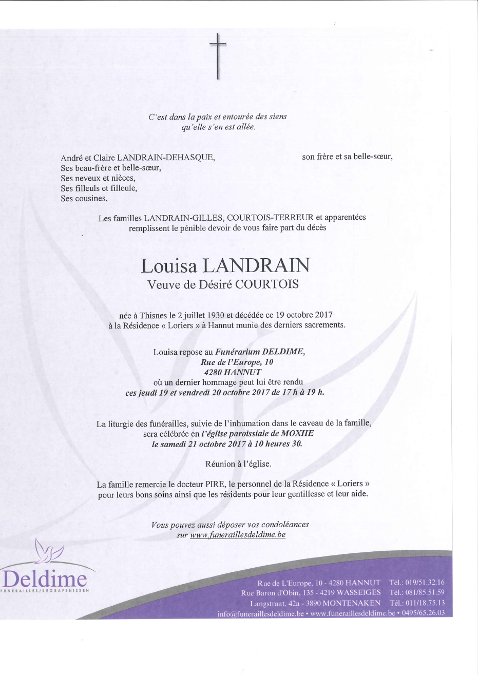 Décédée à Hannut (4280) le jeudi 19 octobre 2017 à l'âge de 87 ans