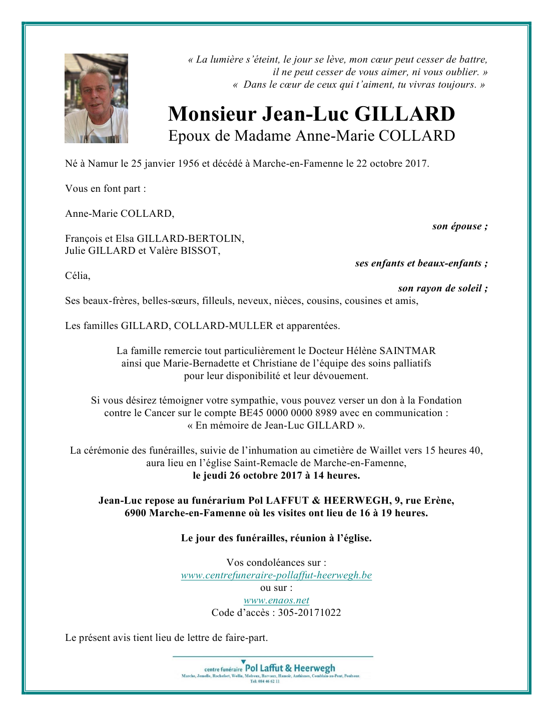 Décédé à Marche-en-Famenne (6900) le dimanche 22 octobre 2017 à l'âge de 61 ans