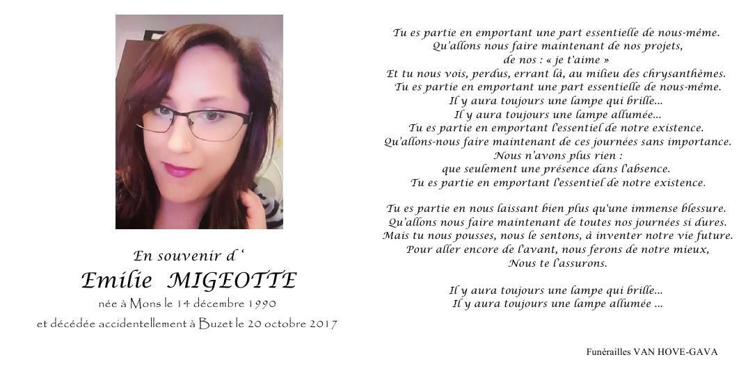 Décédée à Buzet (6230) le vendredi 20 octobre 2017 à l'âge de 26 ans