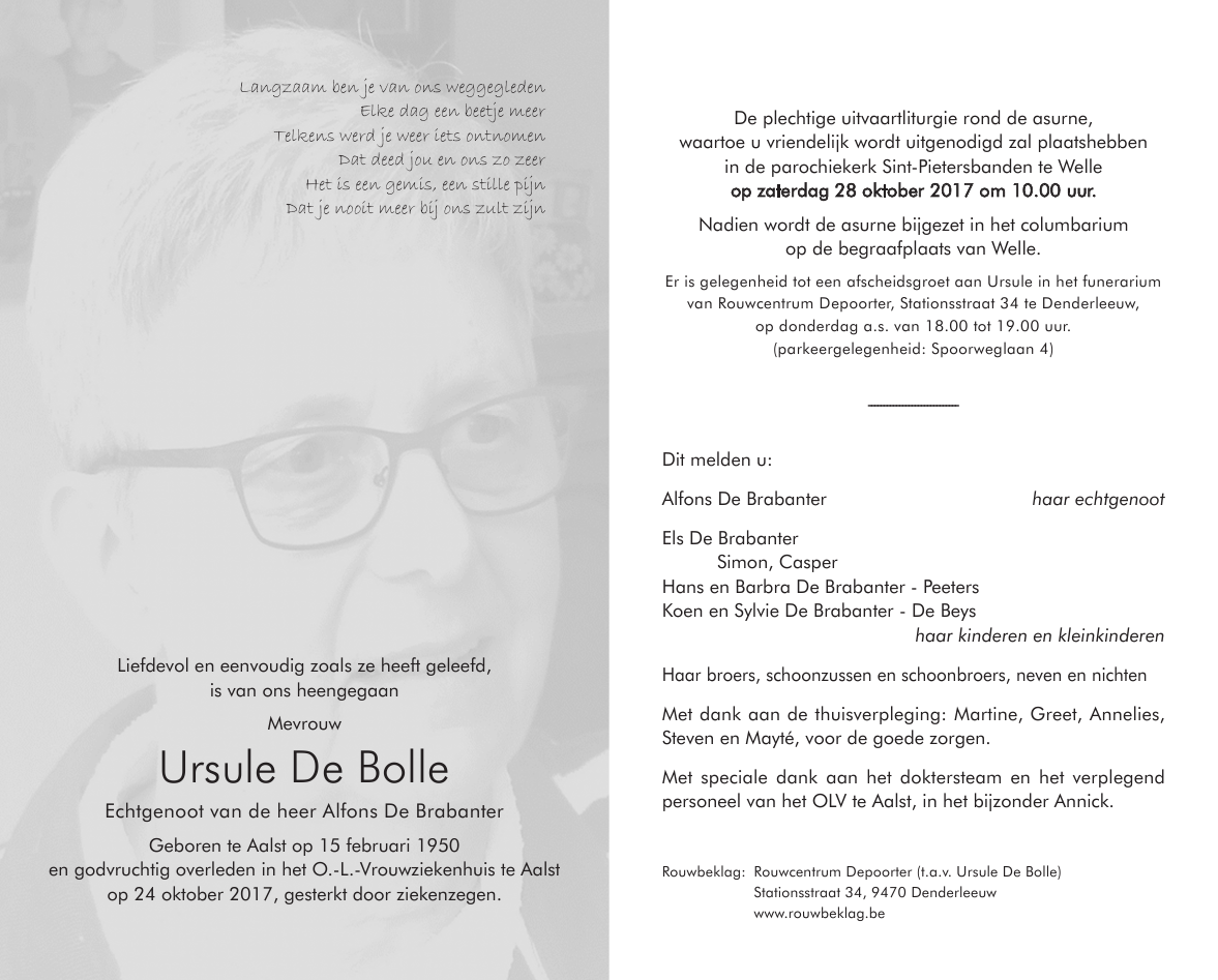 Fallecida en Aalst (9300) el martes, 24 de octubre de 2017 a la edad de 67 años